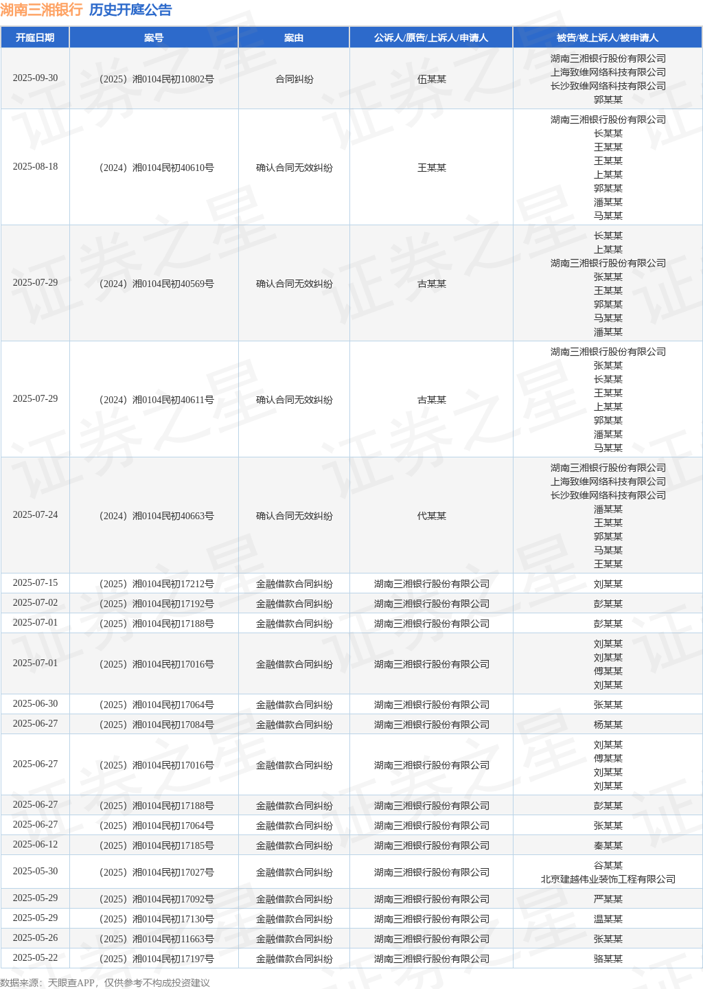 证券之星消息,根据天眼查APP显示,近日公布了一则湖南三湘银行股份有限公司作为被告/被上诉人的开庭公告,详细内容如下: