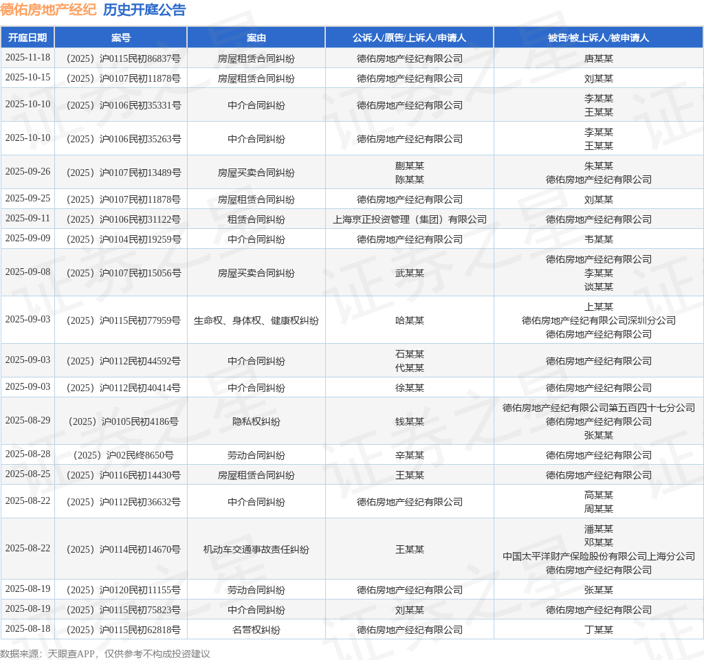 根据统计,近一年内以德佑房地产经纪有限公司为当事人的历史开庭公告有179则,其中案由为“中介合同纠纷”的公告以91则居首,其次为“房屋租赁合同纠纷”有33则,“房屋买卖合同纠纷”有22则。历史开庭公告(前20条)如下: